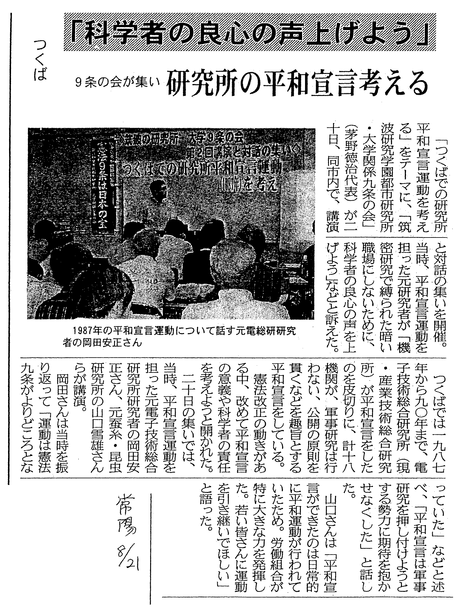 2006年8月20日(日)、第2回講演と対話のつどい「つくばでの研究所平和宣言運動(1987年)を考える」が開かれました。平和宣言は、軍事研究は行わないなどを内容とするもので、多くの研究所で宣言され、その後の研究のありかたに大きな影響を及ぼして来ました。つどいには約50名が参加し、研究所平和宣言の意義と現在の課題などについて話し合われました。